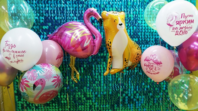— аэродизайн (разноцветные шары с гелием (14 шт.), 2 фонтана, 1 цифра);